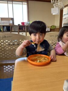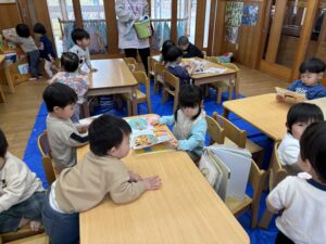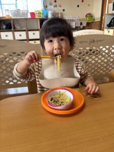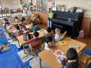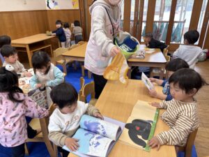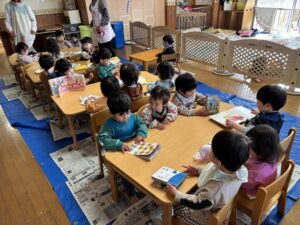 以前はお腹が空いて涙が見られた子もいましたが、最近ではもうすぐお給食の時間!と分かっているのか、準備ができると椅子に座って絵本を見ながら待つ姿が見られるようになってきました✨