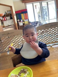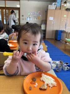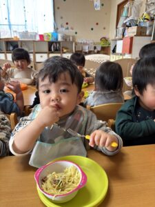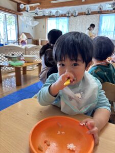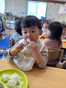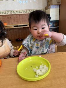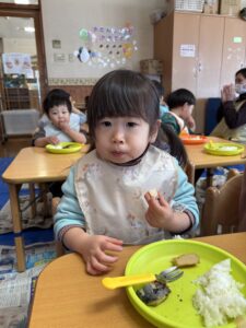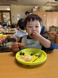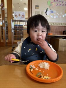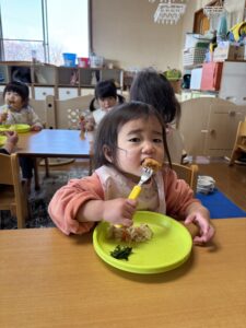 時にはお話を楽しみながら食べている子ども達。まだまだ手掴み食べが見られているので、少しずつスプーンやフォークを使って食べられるように、声をかけています。