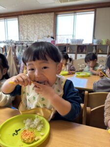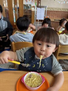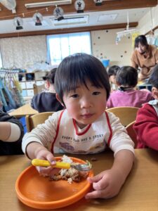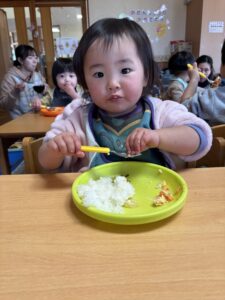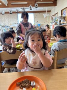 お外遊びやお散歩などでたくさん体を動かして遊んだ後は…大好きなお給食の時間✨