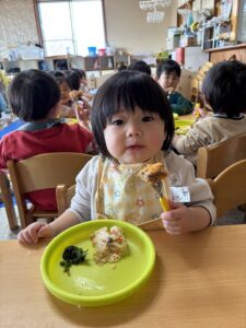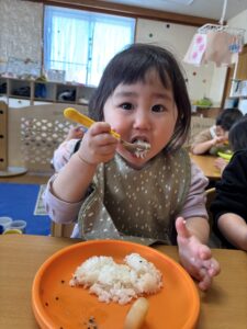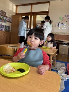 楽しくおいしい給食が食べられるように見守りながら、食事のお約束も少しずつ伝えていきたいと思います