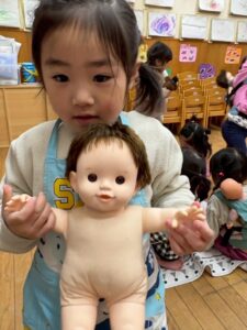 抱っこ紐を使って赤ちゃんを抱っこしたり、「ヨシヨシ ミルクだよ〜」とお世話をして。。