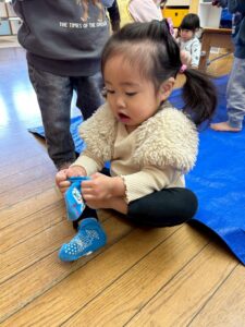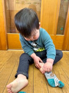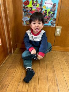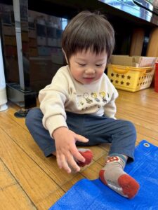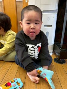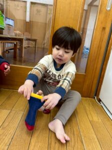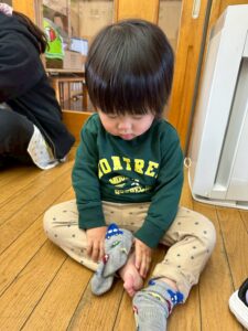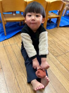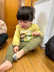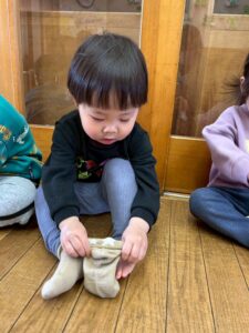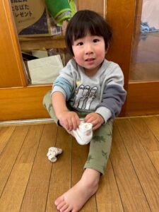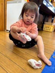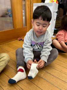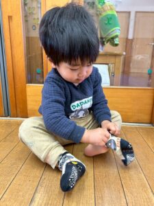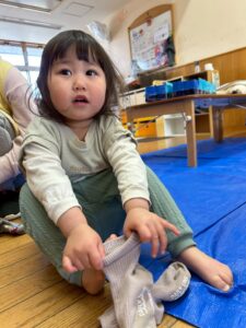 戸外遊びの前に、自分で頑張って靴下を履く練習しようね🙌よいしょ!よいしょ!なかなか難しいなぁ💦💦