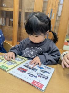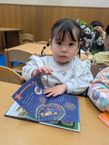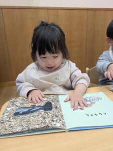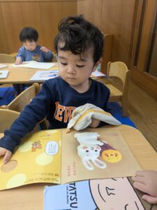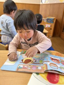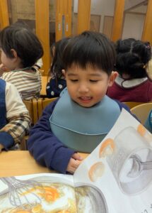 お着替えが終わり給食前には、イスに座って好きな本を読んで待ってます✨順番にエプロンを着けようね🍴☺️