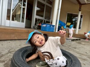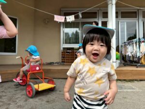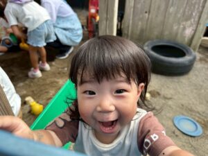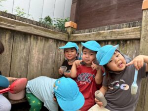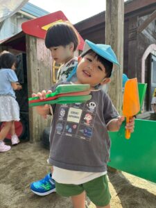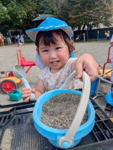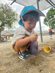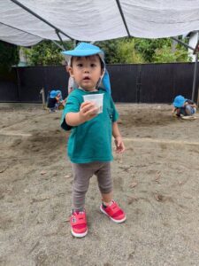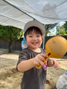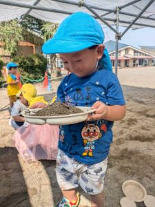 砂場では好きな食べ物を作って先生に見せに来てくれます☺️お話が上手になり、「何つくったの?」と聞くと「けーき!」などと会話のやりとりが楽しいです♪