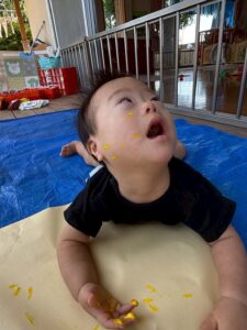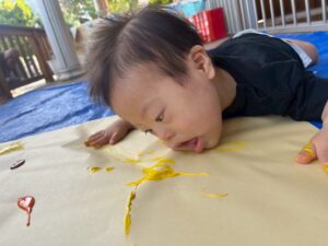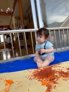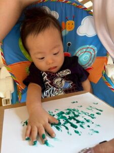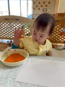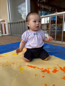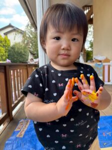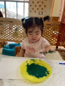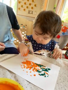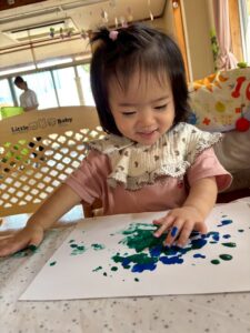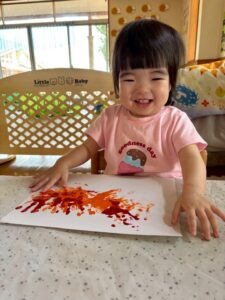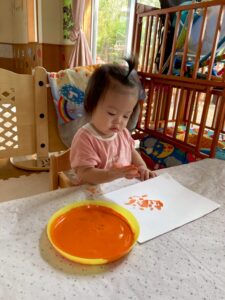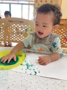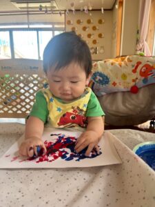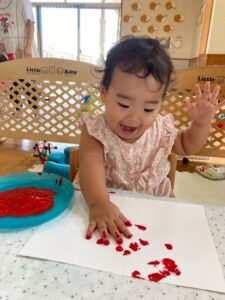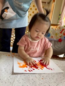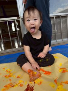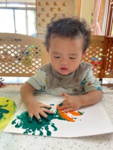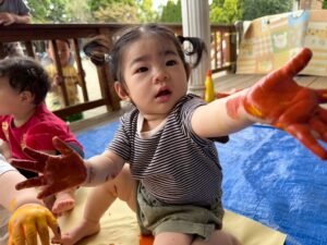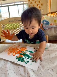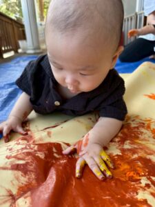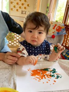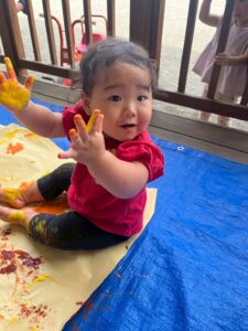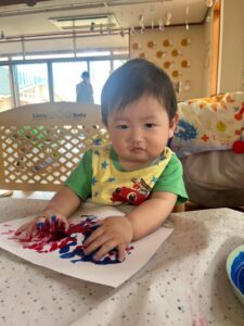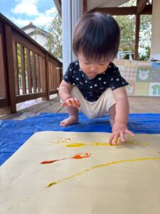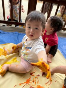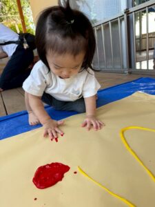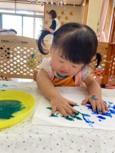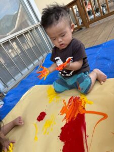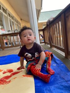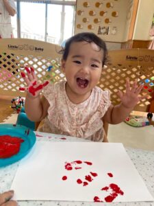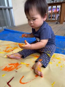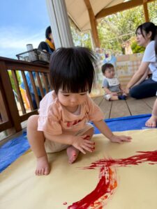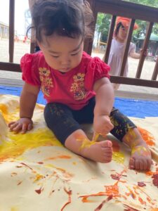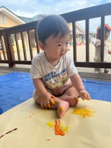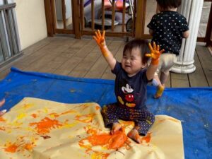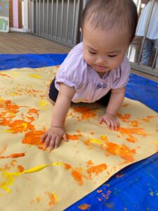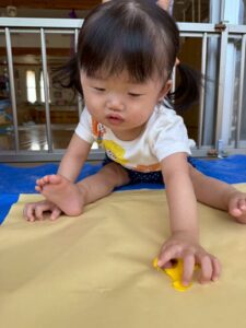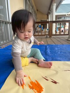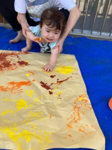 一方で、ダイナミックに楽しんでくれた子も・・・😆絵の具を見つけるとすぐに手を伸ばし、手や足でぺったん!手と手を合わせて塗り塗りしたり、足にも塗ってみたり☺️