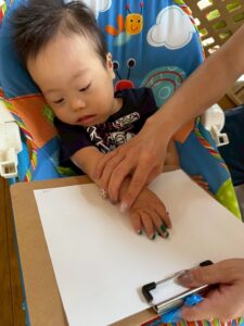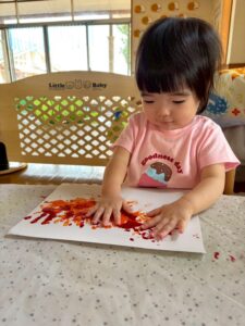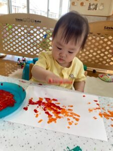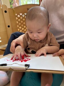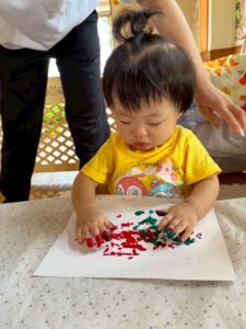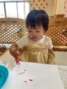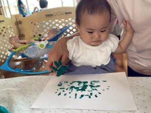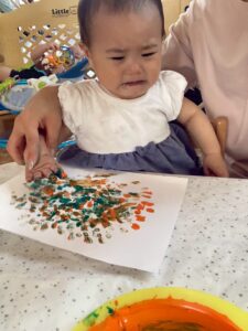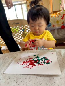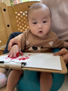 最初は恐る恐るチョンチョンと指で触ってみるお友達が多かったですが、一緒に画用紙にペタッとやってみると自分でもペタペタ楽しむ姿が見られました☺️