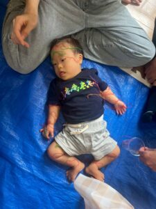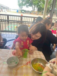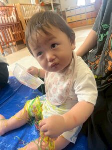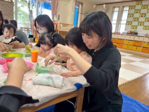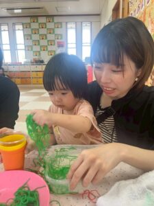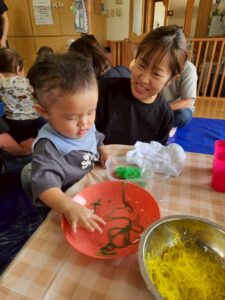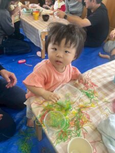 春雨をお皿やカップに入れてみたり、ダイナミックにお顔や体に付けてみたりと、みんな思い思いに楽しんでいました(*^^*)