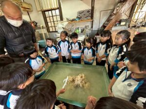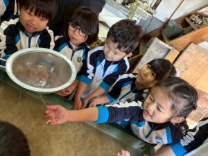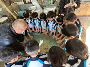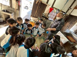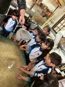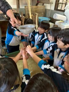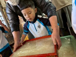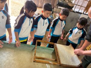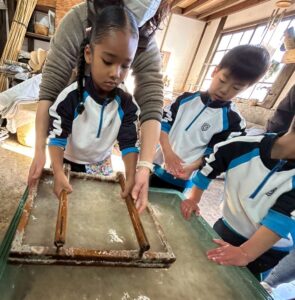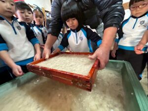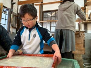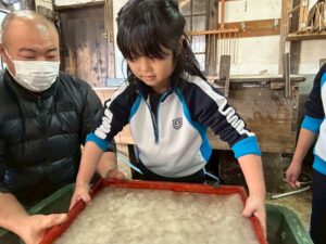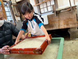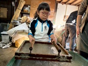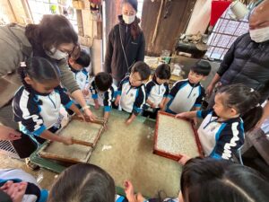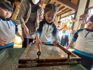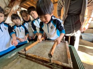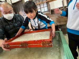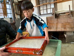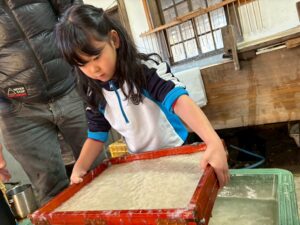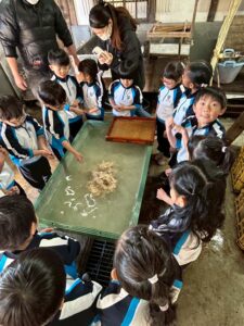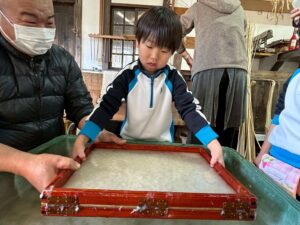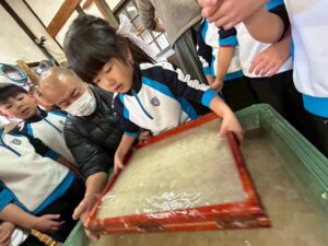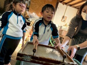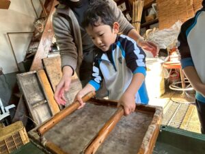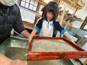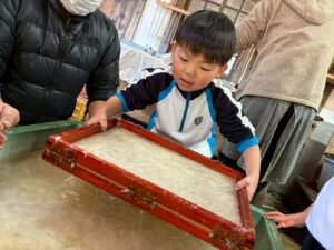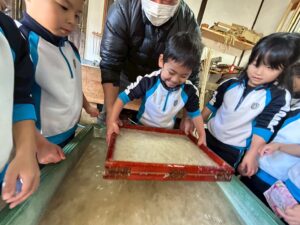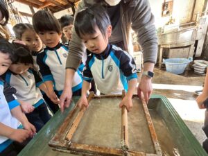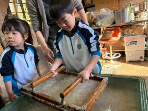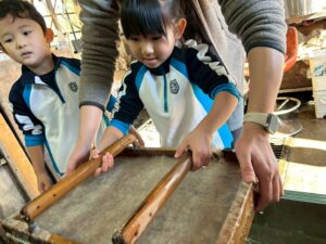 みんな麻紙の形を持ち『重い〜』と水と麻をすくって持ち上げ、水をふるい頑張ってすきました〜✨ニコニコで作る予想が思った以上に真剣な表情で頑張る子ども達‼️真剣すぎて可愛いかったです😄💕様子は動画やお写真でご確認ください〜♪